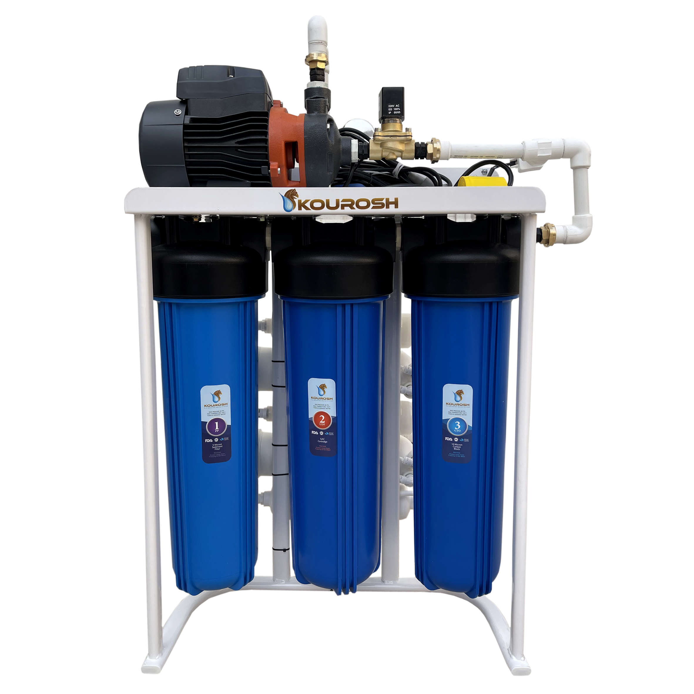 دستگاه تصفیه آب نیمه صنعتی ۱۲۰۰ گالن کوروش یکی از بهترین انتخابها برای محیطهایی با مصرف بالای آب آشامیدنی است. این دستگاه با بهرهگیری از فناوری اسمز معکوس (RO) و سه عدد ممبران قدرتمند، قادر است تا ۴۲۰۰ لیتر آب خالص در شبانهروز تولید کند.